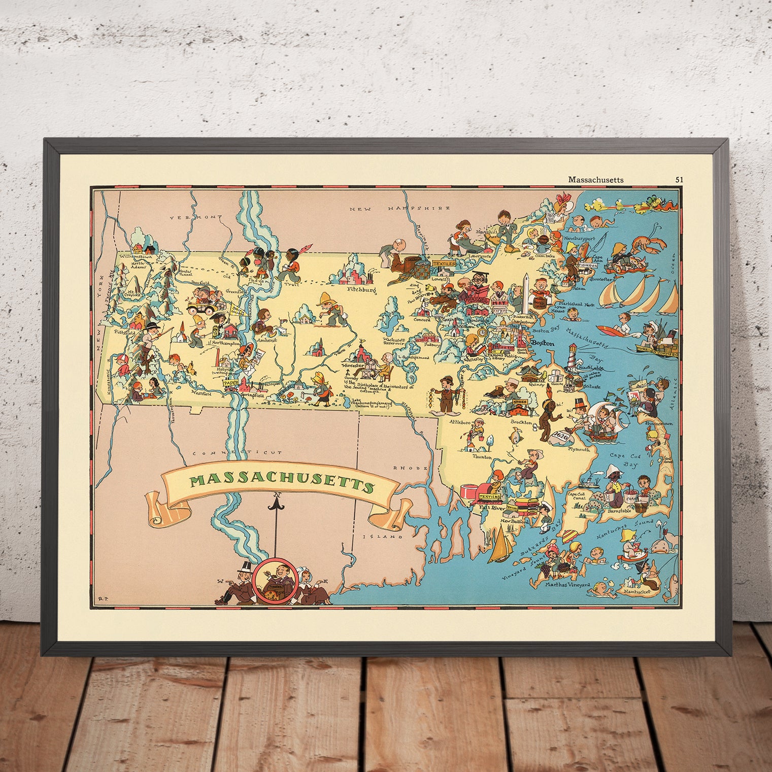 A closer look reveals a rich tapestry of life and landscape. The map is dotted with scenes of cranberry harvesting, dairy farming, and winter sports, each illustration capturing the essence of Massachusetts’ diverse regions. Lighthouses stand sentinel along the rugged coast, while forests and rolling hills offer a glimpse into the state’s natural beauty. The inclusion of Native Americans in traditional dress and Pilgrims landing on its shores pays homage to the deep historical roots that anchor Massachusetts in the American story. Each detail is carefully chosen, providing a window into the customs, industries, and events that have shaped the state’s identity.