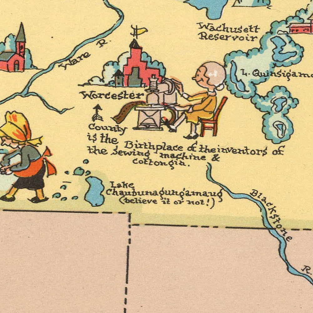 Ruth Taylor White, the celebrated mapmaker behind this work, was renowned for her ability to infuse maps with personality and storytelling. Her pictorial atlases became beloved for their ability to educate and entertain, using vivid illustrations to bring regions to life. White’s Massachusetts map is a testament to her skill, as she transforms the state’s geography into a lively tableau of historical events, industries, and local traditions. Her playful yet meticulous approach ensures that every corner of the map offers a new discovery, from bustling coastal harbors to serene inland farms.
