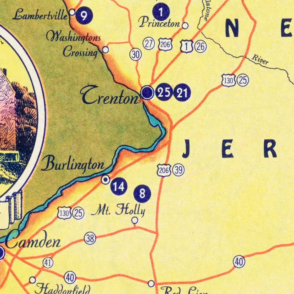 The map’s historical heartbeat is unmistakably Revolutionary. Trenton anchors the Delaware corridor with nods to Washington’s audacious winter crossing and the Battle of Trenton, while nearby Princeton evokes the 1777 engagement and the scholarly aura of Nassau Hall, where the Continental Congress met in 1783. Morristown appears as a bastion of endurance, recalling Washington’s winter encampments at Jockey Hollow. Farther north, Hackensack sits along the route of the Continental Army’s 1776 retreat, a reminder of the precarious early days of independence. Burlington and Elizabeth—among New Jersey’s oldest English-settled towns—connect colonial governance, Quaker roots, and riverine trade. Roads, ferries, and river crossings etched across the map make these episodes legible as a continuous narrative woven through the landscape.