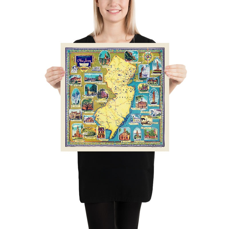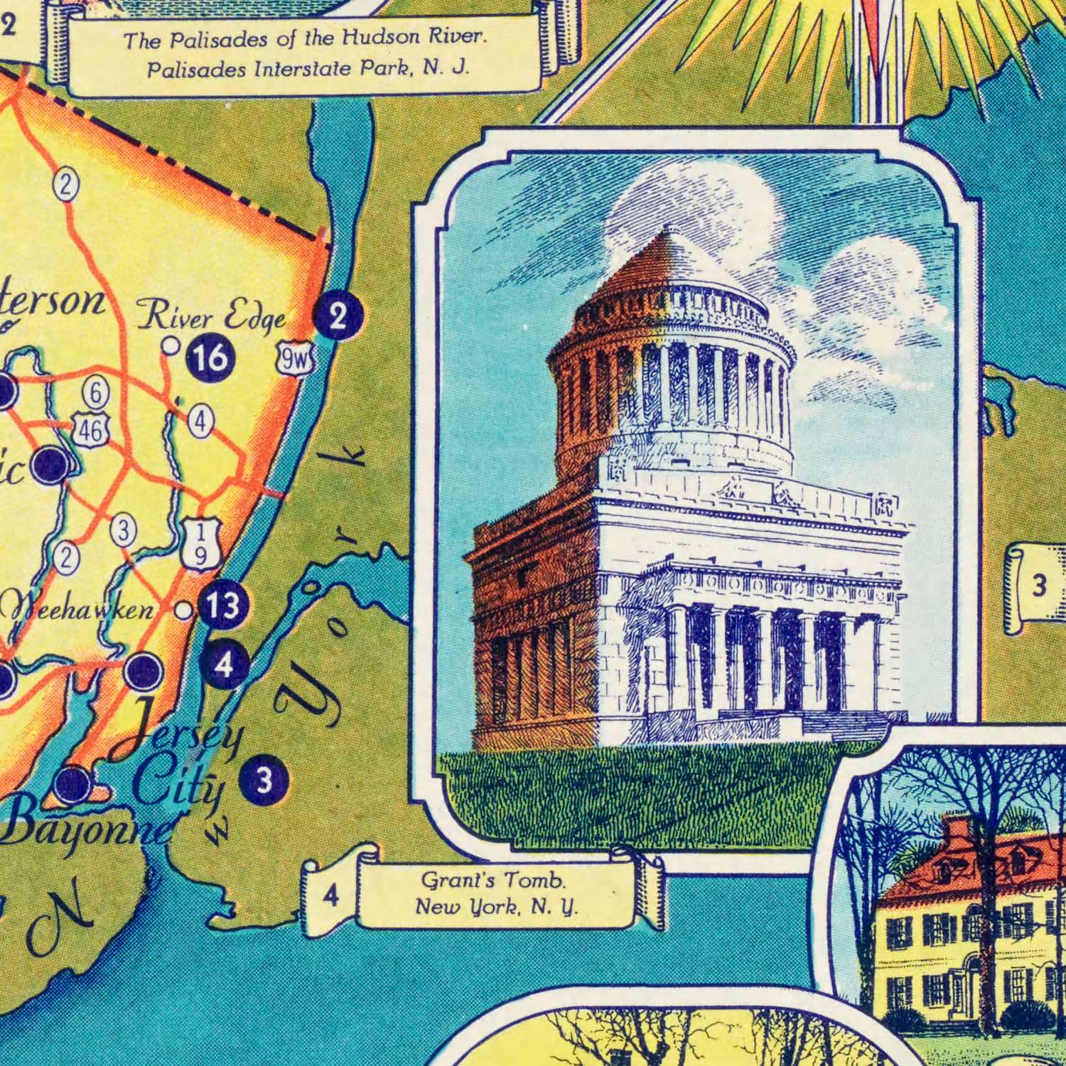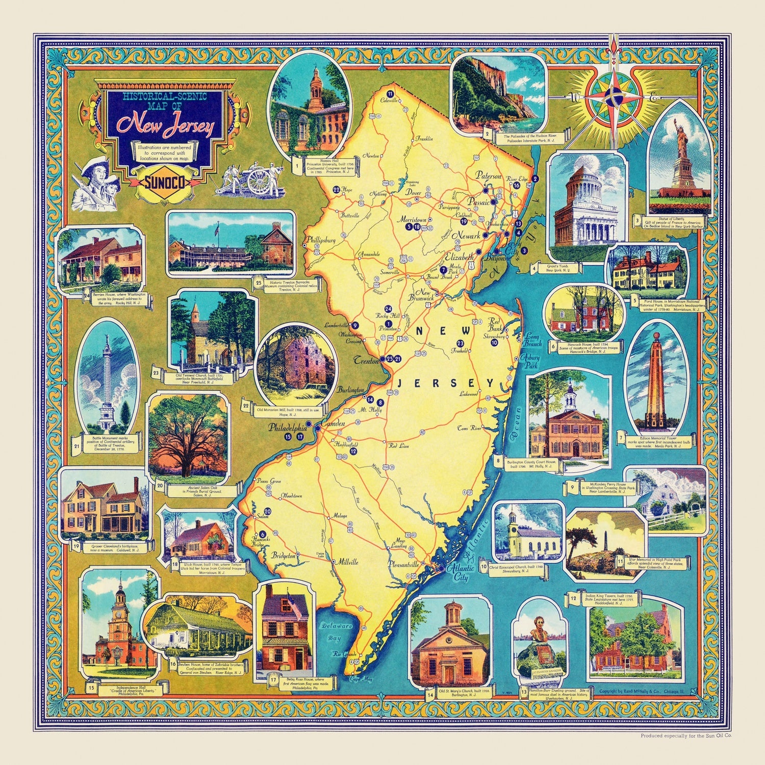 John G. Brink’s Historical-scenic map of New Jersey, produced by Rand McNally & Company in 1940, blends authoritative geography with an engaging pictorial narrative of the Garden State. Political boundaries are crisply delineated, rivers and drainage systems snake across valleys and marshes, and a compass rose fixes north at the top, all enclosed within an ornate border that heightens its decorative appeal. Across this framework, vignettes of historic landmarks and storied locales animate the landscape—cities, towns, and shore communities rendered with personality as well as precision. The result is a vivid early–20th century snapshot: a state poised between colonial memory and modern momentum, where roads, rails, and waterways—carefully traced—knit together industry, scholarship, seaside leisure, and revolutionary heritage.