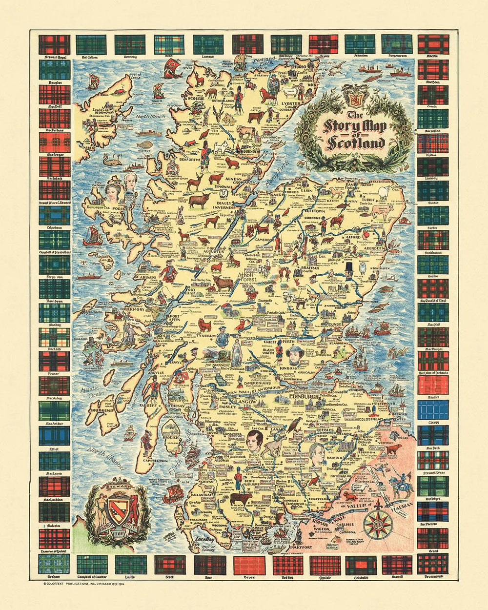 Old Pictorial Map of Scotland, 1935: Edinburgh, Glasgow, Castles, Tartans, Historical Figures