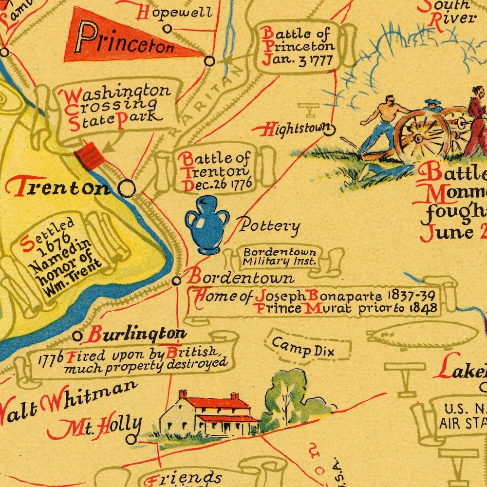 Rare Old Pictorial New Jersey Map by Des Rosiers 1939: Washington Crossing, Trenton-Princeton, Morristown, Monmouth, D&R Canal