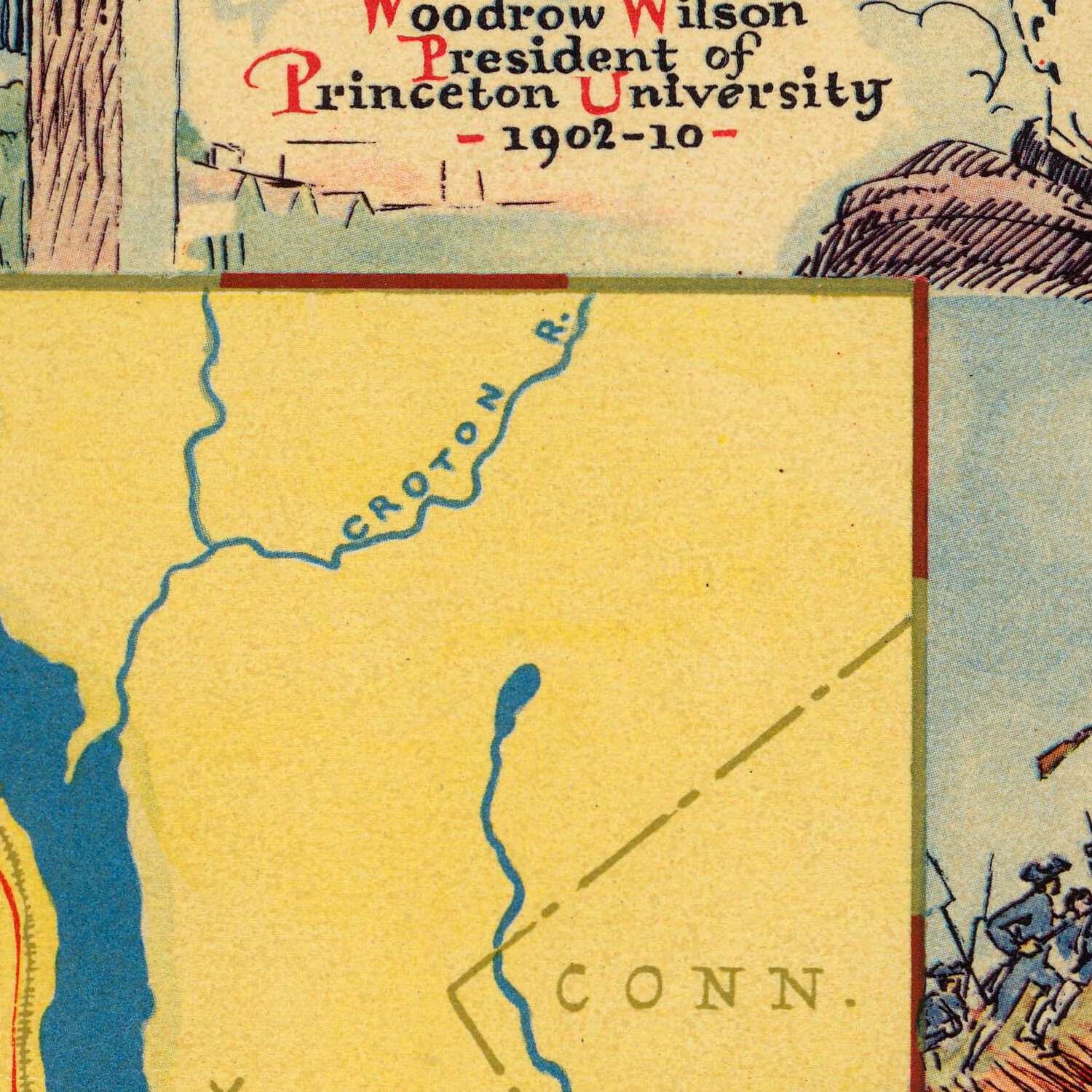 New Jersey’s genius for innovation and leadership also animates the pictorial field. Near East Orange and Passaic, the industrial belt hints at Thomas Edison’s laboratories and the electrified revolution they sparked, while West Orange and Menlo Park lore often accompanies depictions of light bulbs and phonographs. Princeton is crowned by scholarship—Woodrow Wilson’s academic and political ascent and, by the late 1930s, Albert Einstein’s presence at the Institute for Advanced Study—conveying an intellectual gravitas that balances factory skylines. Camden nods to Walt Whitman’s later years and to shipyards that built for war and peace, while Hoboken recalls its World War I role as a port of embarkation. The effect is a people’s gallery in miniature: inventors, poets, statesmen, and workers, each etched into the state’s collective memory.
