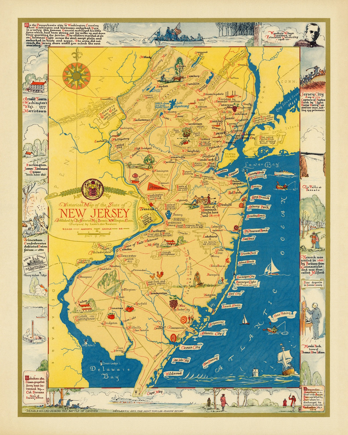 A luminous celebration of New Jersey in 1939, Leon L. Des Rosiers’ Historical Map of the State of New Jersey blends geography and storytelling into a richly illustrated panorama. Across Newark, Jersey City, Trenton, Camden, Atlantic City, and the shore towns from Wildwood to Cape May, the state’s contours are animated with vignettes of landmarks, harvests, and heroics. Decorative borders and cartouches lend a heraldic air, while a bold compass rose orients the viewer to the Atlantic and the Delaware. Callout boxes punctuate the surface with crisp historical anecdotes, and the pictorial relief—rivers, pine forests, rolling uplands—sets stage for scenes of mills, campuses, and boardwalks. Roads, rail lines, canals, and airports trace an intricate web, making the map a narrative atlas of movement, invention, and identity.
