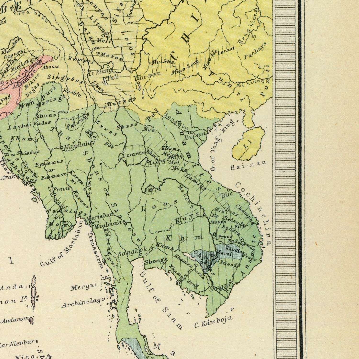 Topography is conveyed with Bartholomew’s hallmark restraint: spot heights and measured shading produce a tactile sense of the land without overwhelming the political story. The Himalaya surge along the northern rim, feeding the Indus, Ganges, and Brahmaputra systems whose broad alluvia shape the subcontinent’s human geography. The Western and Eastern Ghats frame the Deccan plateau, while the Vindhya and Satpura ranges articulate central India. Eastward, the Arakan Yoma and Tenasserim ranges march down Burma toward the Isthmus, projecting into the Andaman Sea. Great rivers—the Godavari, Krishna, and Kaveri in the south—anchor agrarian basins and portage routes, with deltas etching their way to Madras (Chennai), Calcutta (Kolkata), and Colombo.