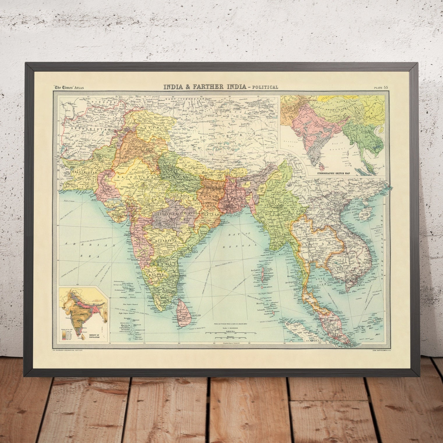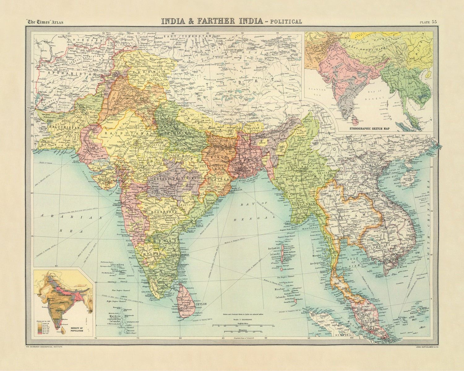 Two analytical insets deepen the map’s explanatory power. An ethnographic sketch, characteristic of British atlases of the period, aggregates populations across linguistic and cultural zones, offering a schematic—if necessarily reductive—overview of diversity from the Gangetic plain to Burma’s coastal lowlands and upland tracts. A companion density-of-population map highlights the demographic weight of the Indo-Gangetic heartland and Bengal delta, contrasted with the sparser Deccan interior, the Thar margins, and Burma’s high country. Together, these visual essays bridge politics, land, and people, clarifying why cities like Bombay, Delhi, Madras, Calcutta, Bangalore, Rangoon, Bangkok, and Colombo emerge as nodal points in Bartholomew’s enduring cartographic vision.