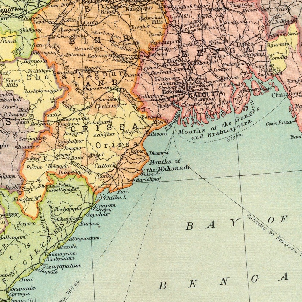 Maritime intelligence is a defining feature of the sheet. Shipping routes, with their annotated distances, stitch Bombay (Mumbai), Calcutta, Madras, Colombo, Rangoon (Yangon), and Bangkok into a web of imperial logistics. The lines sweep across the Arabian Sea and the Bay of Bengal, converging toward the world-artery of the Suez route and radiating along monsoon-tested corridors to the Straits and the South China Sea. These plotted rhumb lines succinctly express the commercial and strategic logic of the era: coal bunkers, cable stations, and monsoon windows translating geography into time and tonnage, and underscoring how ports and hinterlands were synchronized for trade and governance.