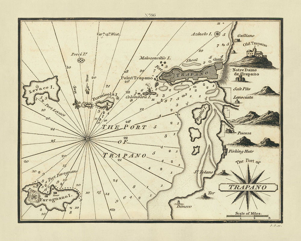 The Port of Trapano, meticulously charted by William Heather in 1802, stands as a quintessential example of early 19th-century nautical cartography. This chart, a critical piece of Heather's The New Mediterranean Pilot, delineates the intricate details of the Sicilian coastline, focusing on the strategic port town of Trapani. Its significance is manifold; not only does it serve as a navigational aid, highlighting water depths, hazards, and landmarks, but it also encapsulates a snapshot of maritime life in the Mediterranean during a time of burgeoning English naval interest in the region. The chart's precision and detail reflect the heightened need for accurate maritime charts as English ships ventured more frequently into Mediterranean waters.