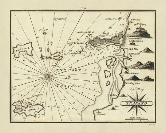 Heather's chart is far more than a simple guide; it is a rich tapestry of local geography and human activity. It meticulously marks the salt pits and fishing huts that were integral to Trapani's local economy, alongside the more monumental features such as the Torre di Ligny and the Lazzaretto di Trapani. Each of these features is not just a point on a map but a doorway into the daily lives of those who lived and worked in Trapani in the early 1800s. The inclusion of such details offers a vivid glimpse into the socio-economic conditions of the time, making this chart a valuable resource for both navigators and historians.