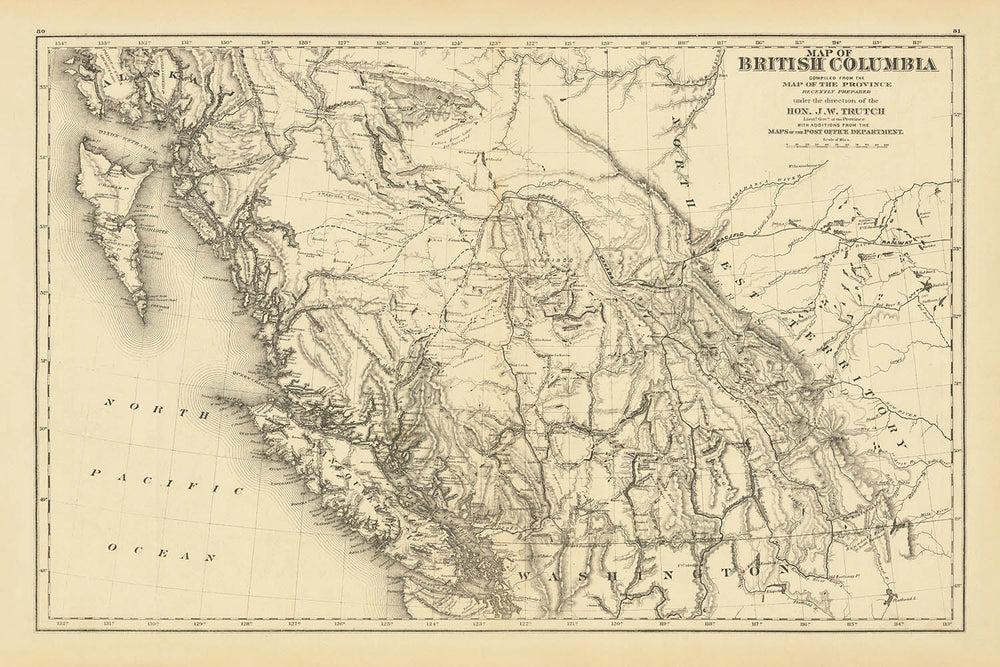 Immerse yourself in the rich history of British Columbia with the "Map of British Columbia Compiled from the Map of the Province Recently Prepared under the direction of Hon. J.W. Trutch." Crafted in 1878 by Joseph William Trutch, this map offers a captivating glimpse into a pivotal era. Trutch, a prominent figure in British Columbia's entry into the Canadian Confederation, meticulously compiled this map to illustrate the burgeoning province's political and physical landscape. The map is a testament to Trutch's vision and the strategic importance of the Canadian Pacific Railway, a project that promised to connect the province to the rest of Canada.