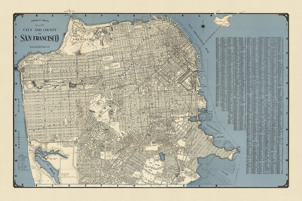 This 1938 map, titled 'City and County of San Francisco', published by Thomas Brothers, is a detailed and fascinating look at the city of San Francisco as it existed nearly a century ago. The map covers the entire northern peninsula of San Francisco, reaching as far south as McLaren Park and Lake Merced, and includes the iconic Golden Gate Bridge, which had recently been completed and is prominently displayed at the top of the map.