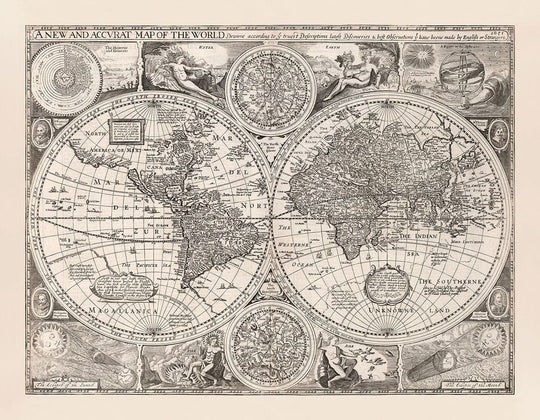 Back in 1651, our understanding of the world wasn't quite what it is today. California is an island! And there's no Antarctica or Australia - just the 'Southern Unknown Land'. Take a closer look at North America and there are some very early settlements on there - including some that have been completely fabricated by the mapmaker! And why does North America swing off wildly to the west in the top corner?