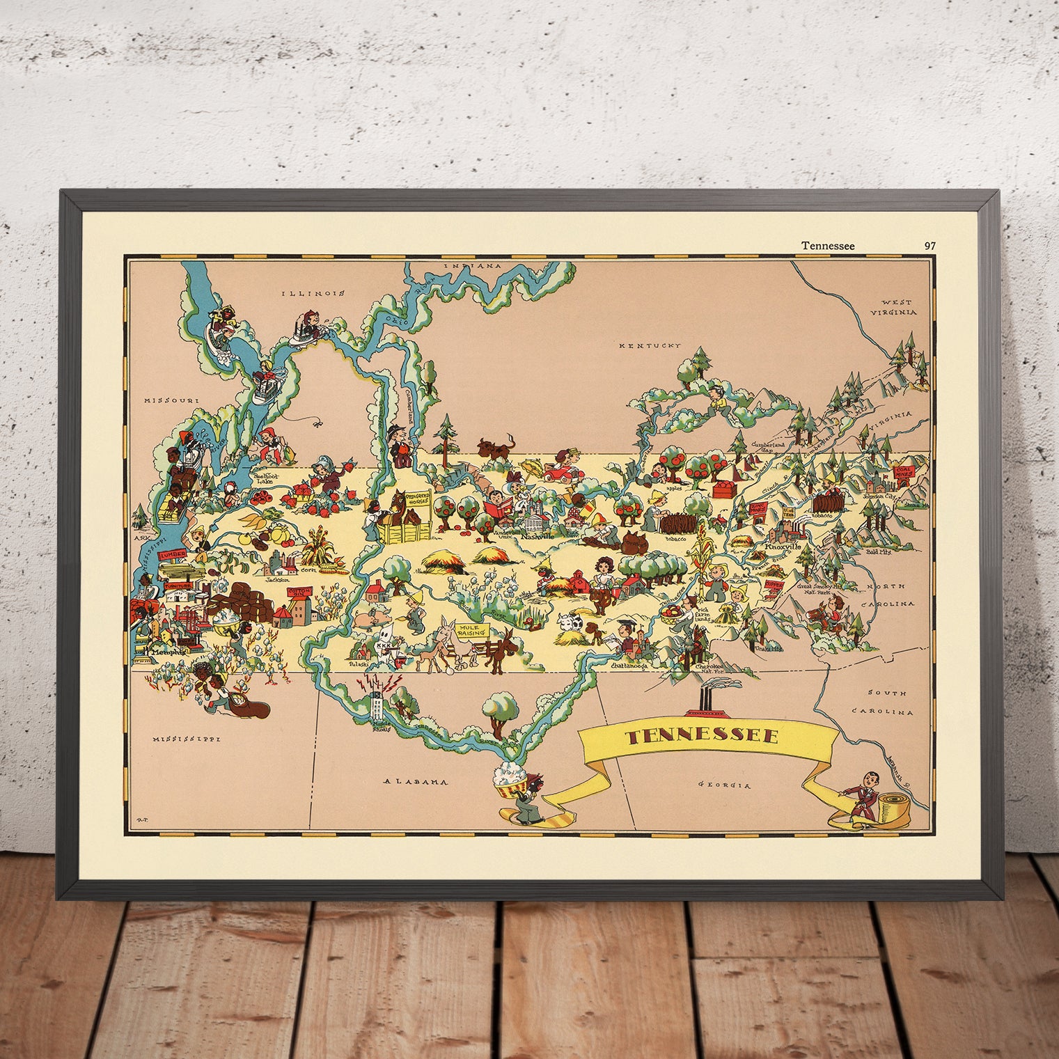 A closer look reveals a rich tapestry of local life and industry, with illustrations that celebrate Tennessee’s agricultural and musical heritage. Cotton and tobacco fields stretch across the countryside, while livestock graze contentedly and steamboats ply the rivers. Playful caricatures of musicians with banjos and fiddles pay homage to the state’s pivotal role in American music, while scenes of hunting, fishing, and traditional dance capture the rhythms of daily life. Each pictorial element is a loving nod to the state’s identity, inviting viewers to imagine the stories and traditions that shaped Tennessee in the 1930s.