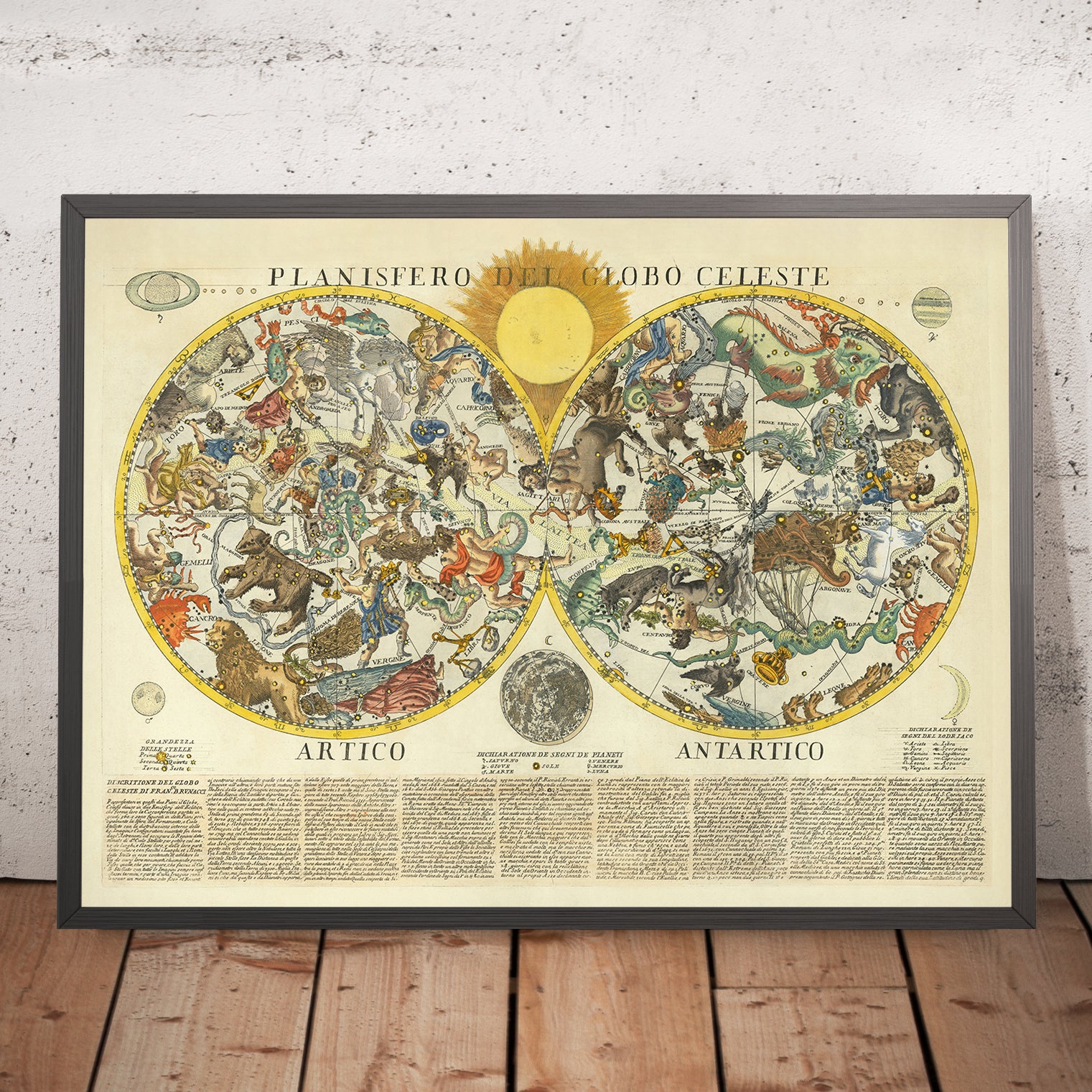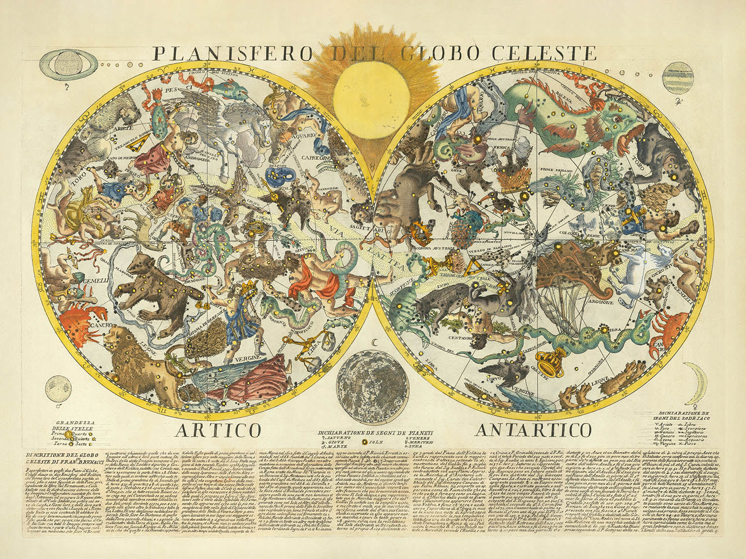 Planisfero Del Globo Celeste is a sumptuous marriage of science and spectacle, conceived by the Italian astronomer Giacomo Brunacci and published by Paolo Petrini in Naples in 1700. A rare celestial chart of the 17th century, it presents the northern and southern hemispheres in harmonious dialogue, with the sun and moon presiding above and the known planets—Saturn, Jupiter, Mars, Venus, and Mercury—elegantly arrayed. The result is a radiant portrait of the heavens at a moment when astronomy and cartography were surging forward in tandem.