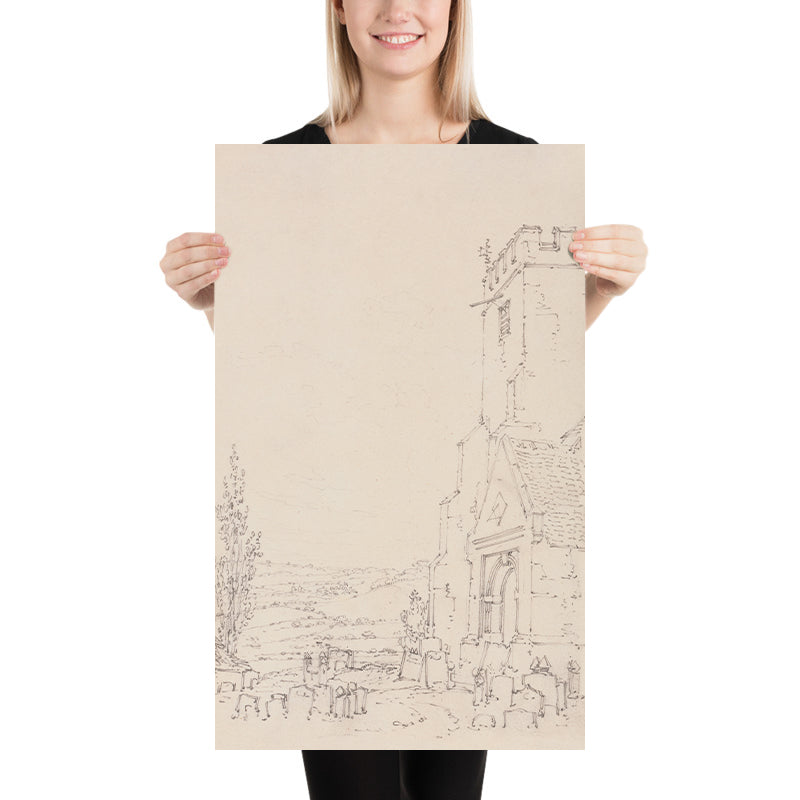 The subject here—an unidentified church—embodies Romanticism’s reverence for the picturesque and the timeworn. The weathered stonework and quiet churchyard speak to centuries of local life and devotion, evoking nostalgia and reflection. The modest grave markers in the foreground deepen the meditation on memory and mortality, themes that resonate strongly in late-18th-century art and literature. Whether or not the building is strictly Gothic, its medieval character and village setting cue the viewer to a longer story etched into the landscape.