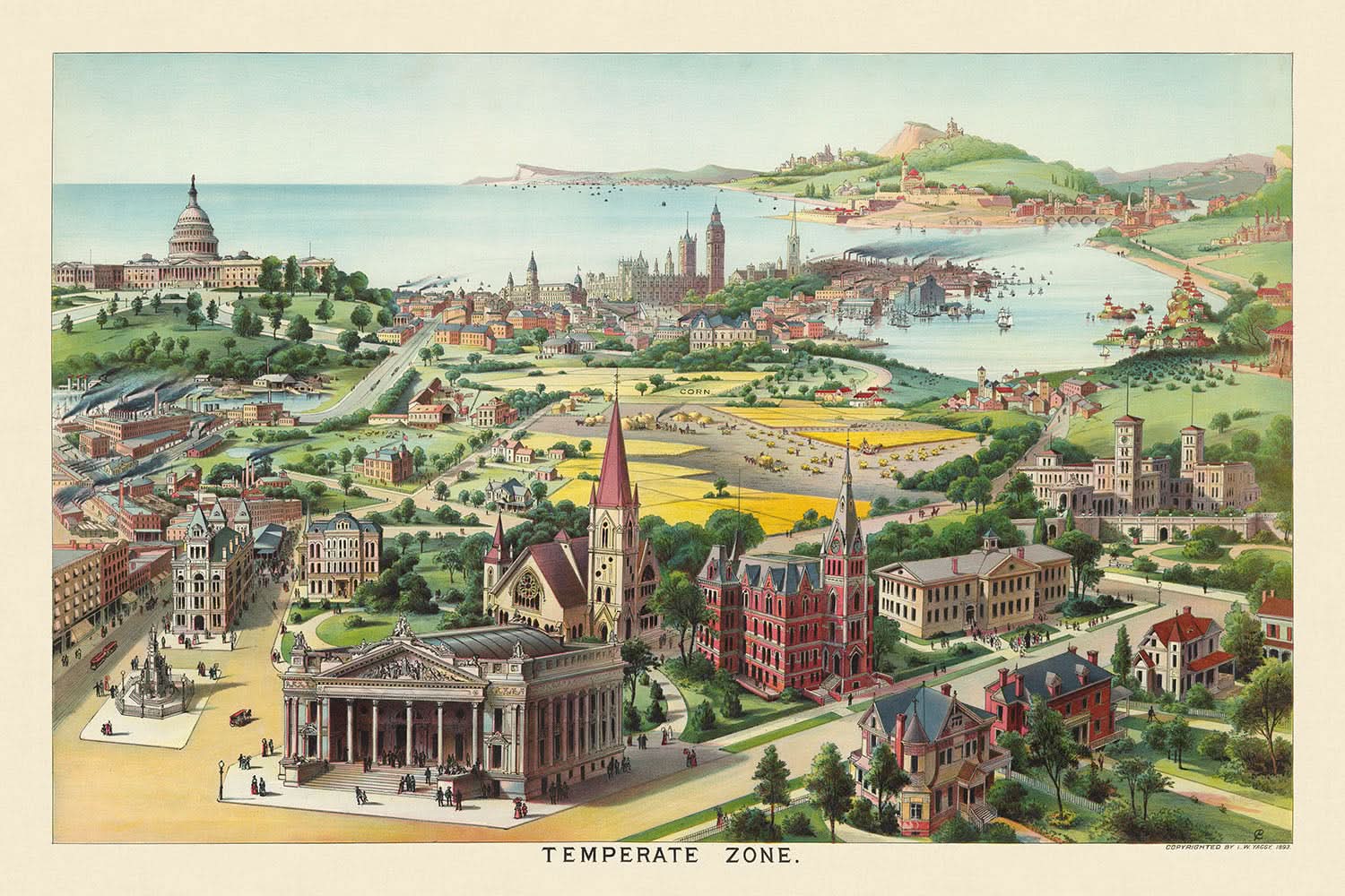 "Temperate Zone" by Levi Walter Yaggy is an extraordinary piece, part of Yaggy's collection of educational charts created in 1893. Known for his innovative use of chromolithography, Yaggy created educational materials of stunning aesthetic and scholastic value. His works, esteemed for their vibrant colors and dynamic contrasts, guided young minds through geography, geology, and astronomically-related subjects in the late 19th century.