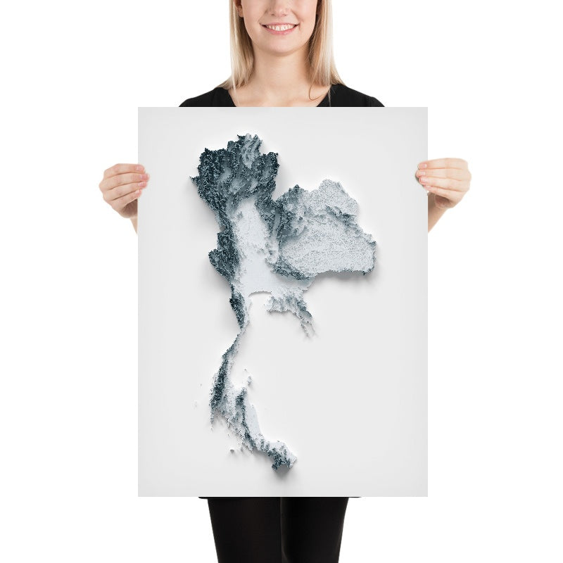 This is a minimalist topographical relief map of Thailand, created by The Unique Maps Co. and enhanced with our trademarked Unique 3D process. There are no labels, no roads, and no towns — just landforms revealed by carefully sculpted light and shadow. Raking highlights pick out high peaks and knife-edged ridgelines, while soft, pooled shade settles into low valleys and floodplains so you can navigate the country by terrain alone.