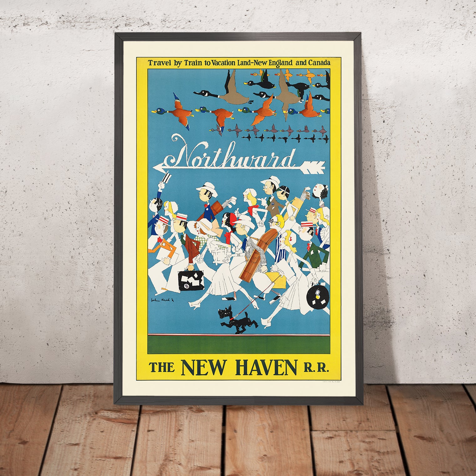 Northward is notable as a snapshot of the burgeoning leisure culture that travel posters helped to create. Its cast of characters—each poised for adventure with luggages and gear—embodies the idea of heading “up” to cooler climes, lakes, forests, and coastlines. The upward-tilting arrow and the flock of ducks together compose a visual itinerary: a shared journey, a brisk departure, the pull of nature and fresh air. It’s a clever, minimal narrative that captures the allure of going north for holidays, whether to New England and the Great Lakes, Canada, Scandinavia, or Alaska.
